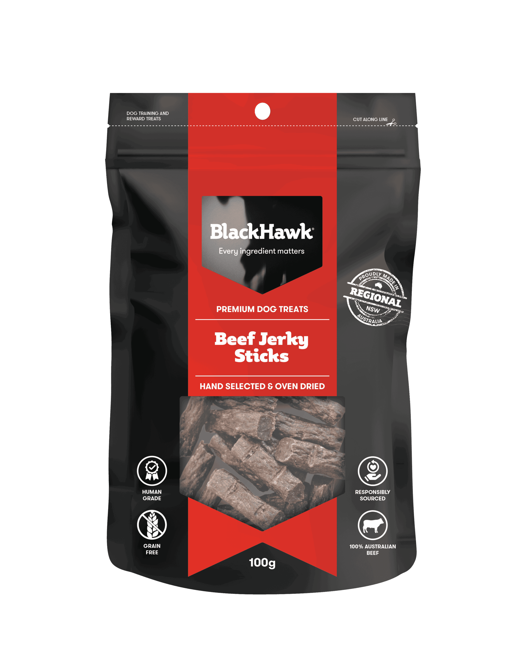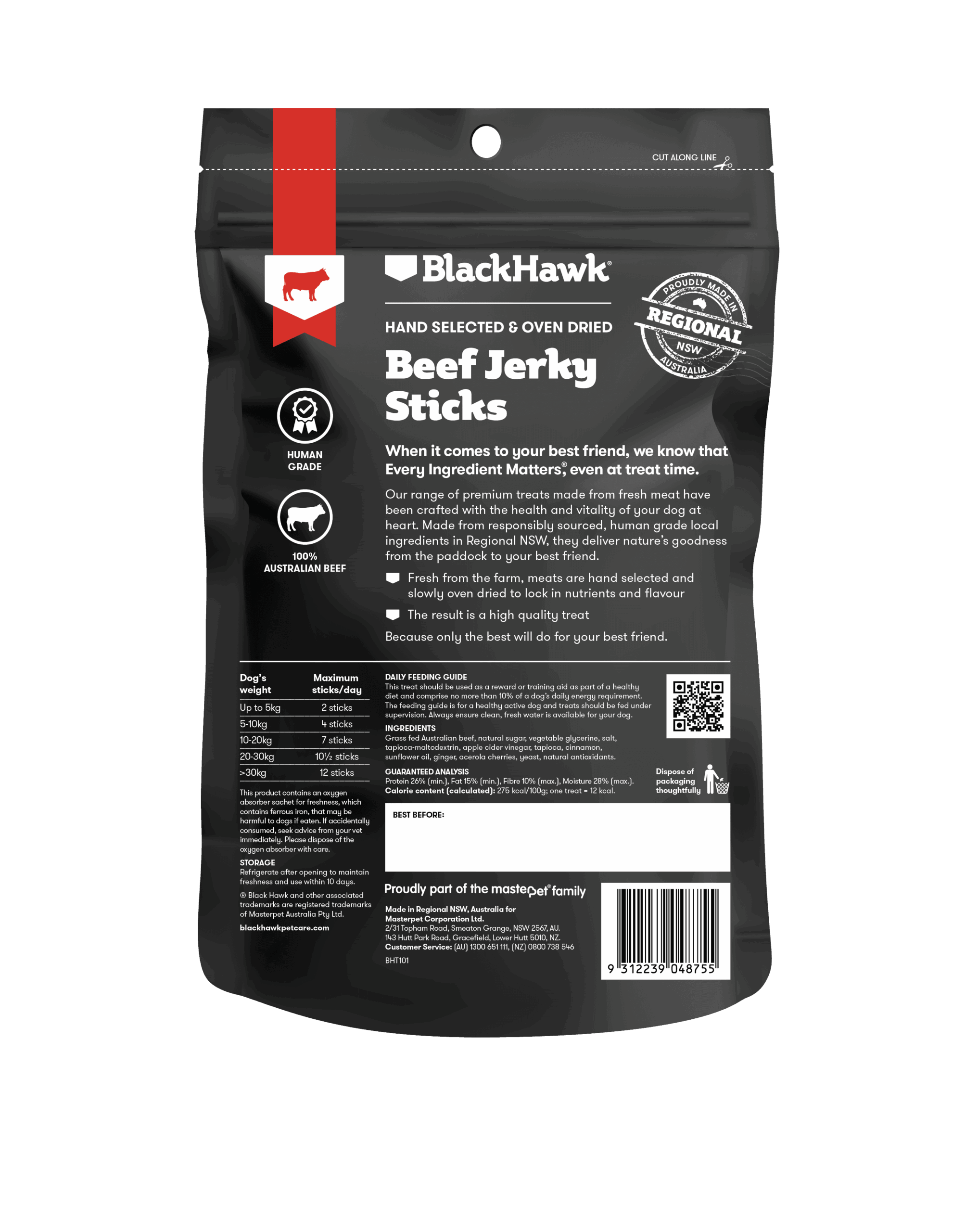 Black Hawk Beef Jerky Sticks are approximately 40mm long and 8-10mm thick. The result is a high quality treat ideal for small to medium dogs over 12 months of age.