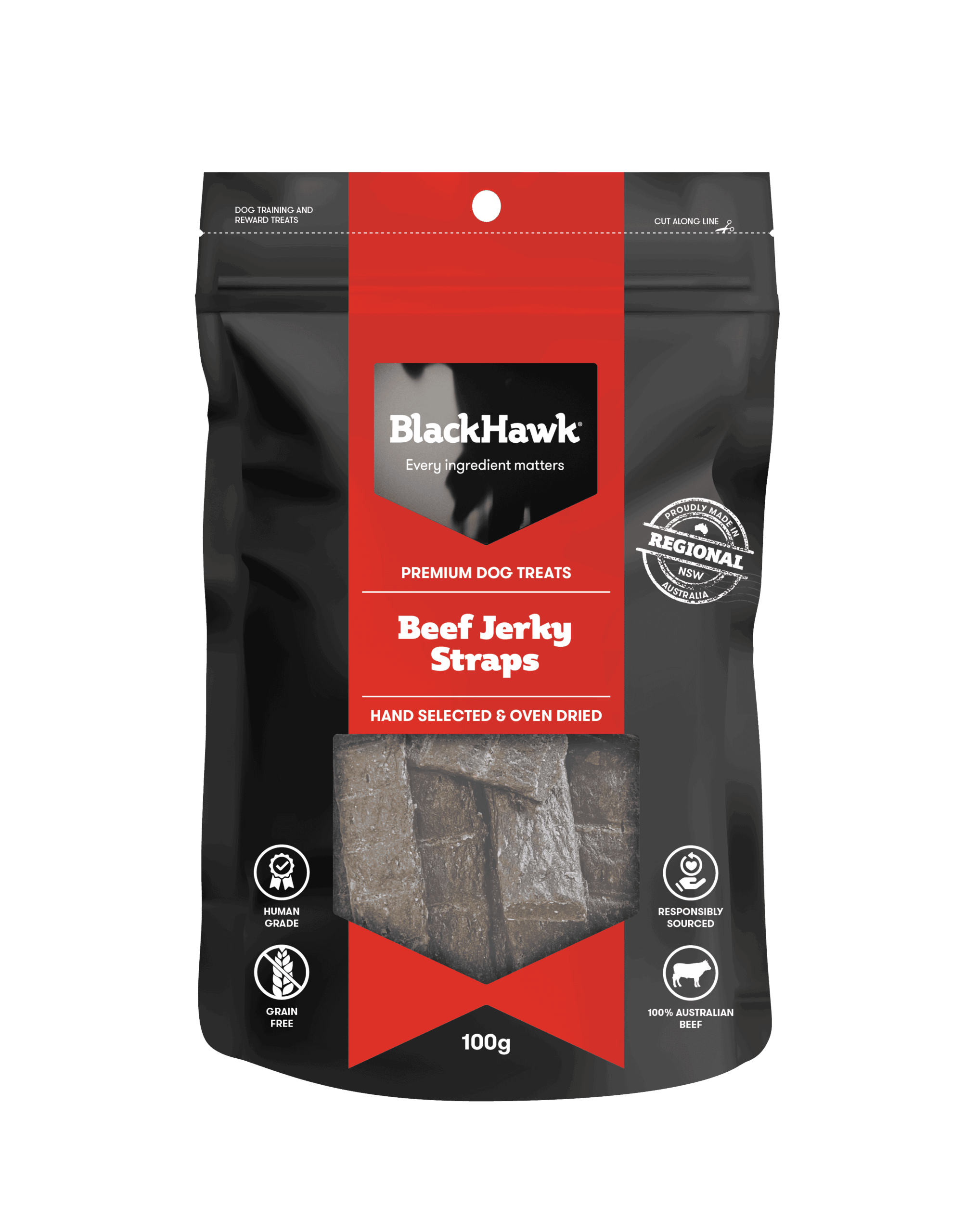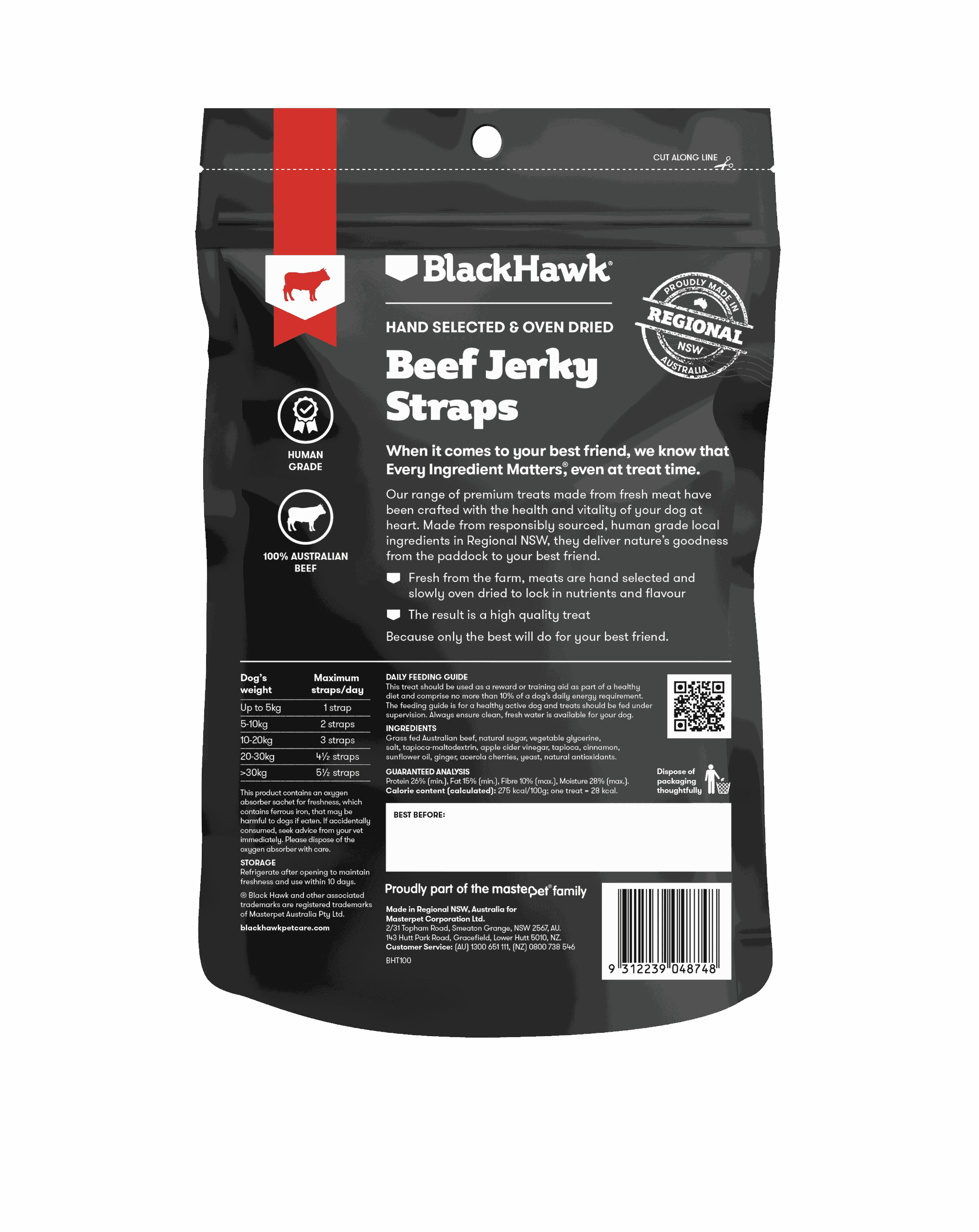 Black Hawk Beef Jerky Straps are approximately 80mm long and 15mm wide. The result is a high-quality treat ideal for medium to large dogs over 12 months of age.