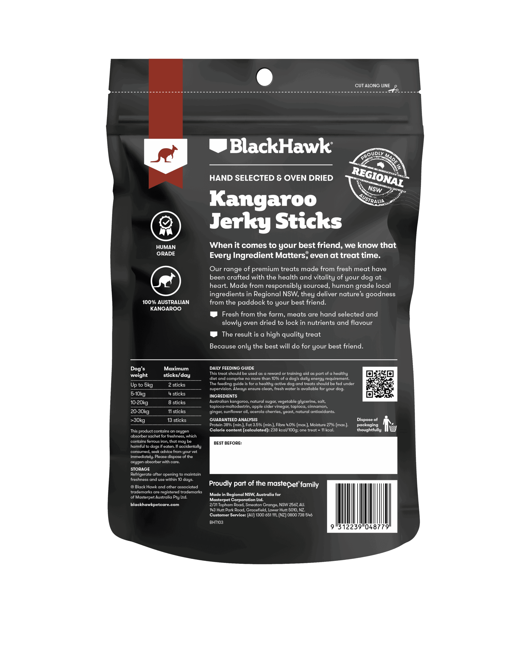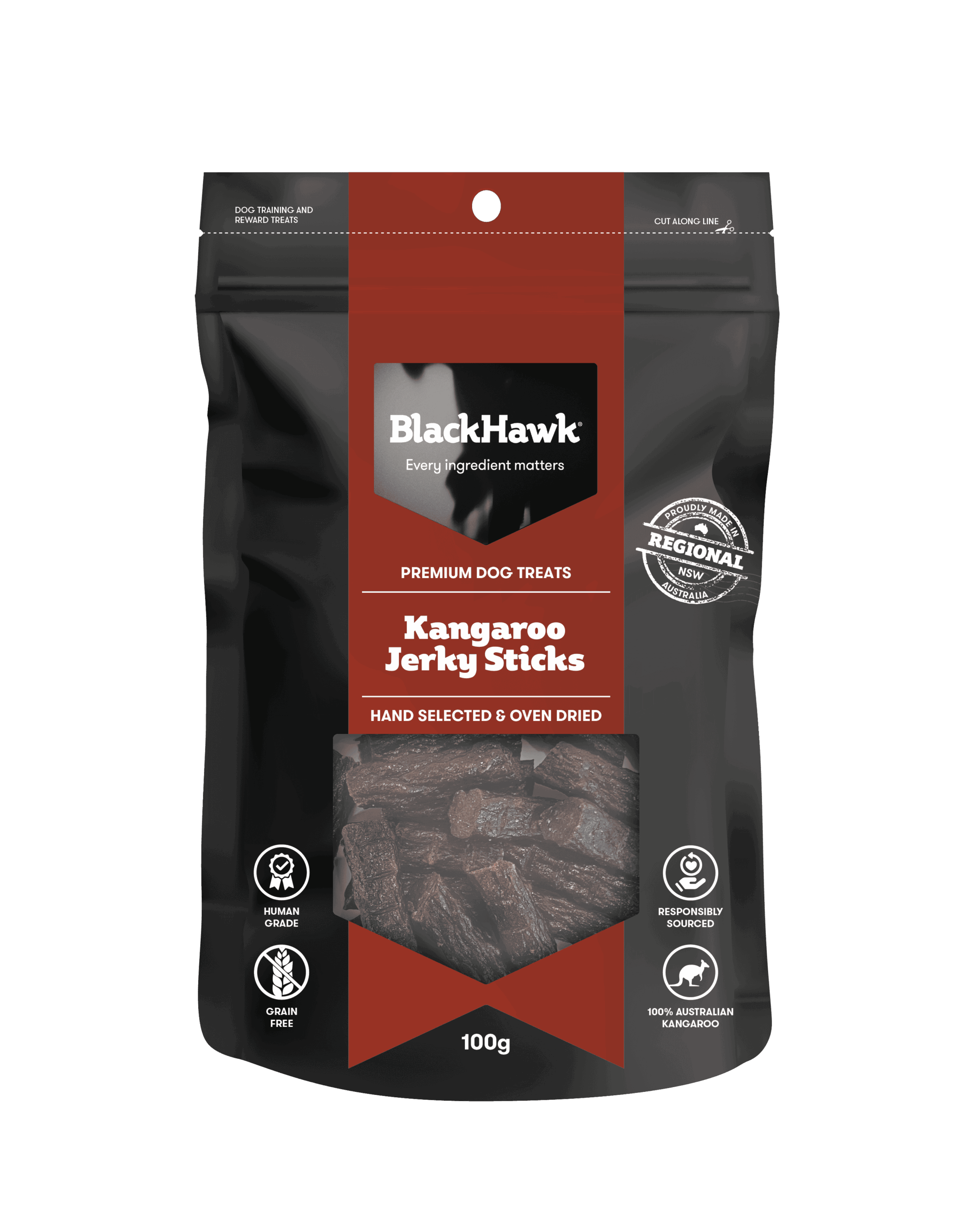 Black Hawk Kangaroo Jerky Sticks are approximately 40mm long and 8-10mm thick. The result is a high quality treat ideal for small to medium dogs over 12 months of age.